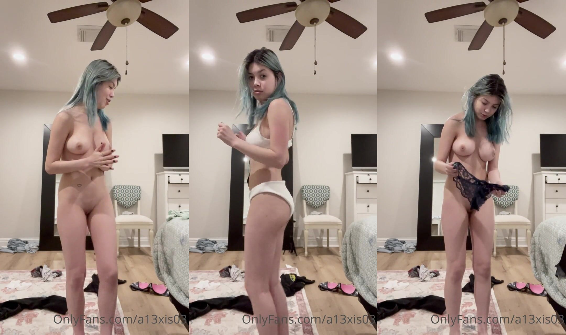Blue-Haired Babe @a13xis09 Nude Try on Haul in Bedroom OnlyFans Video