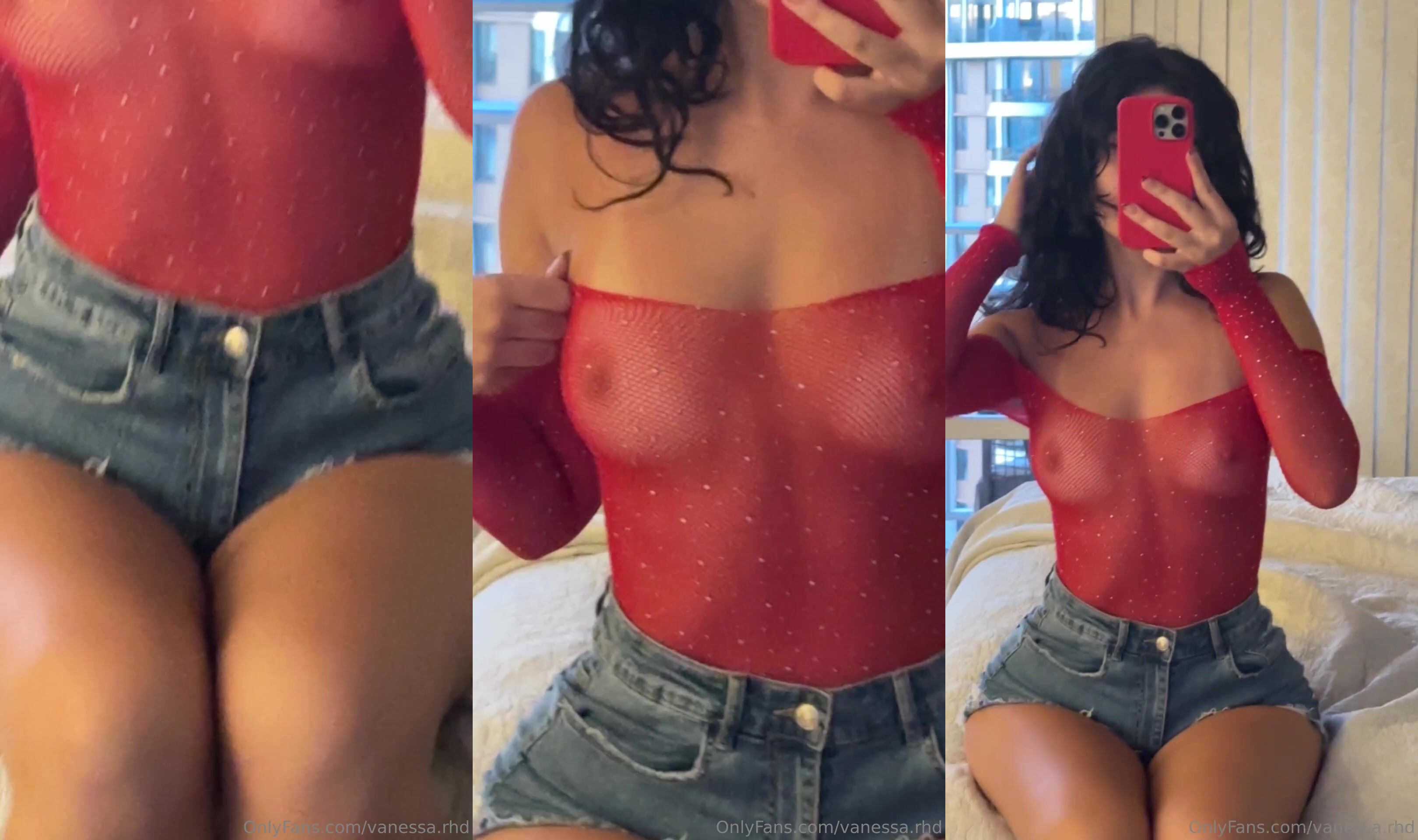 In this steamy clip, a sultry woman teases with a red phone in hand, her toned abs glistening under the light. She strikes playful poses in a red mesh top and denim shorts, giving a peek at her curves. Watch her confidently flaunt her body, leaving nothing to the imagination.