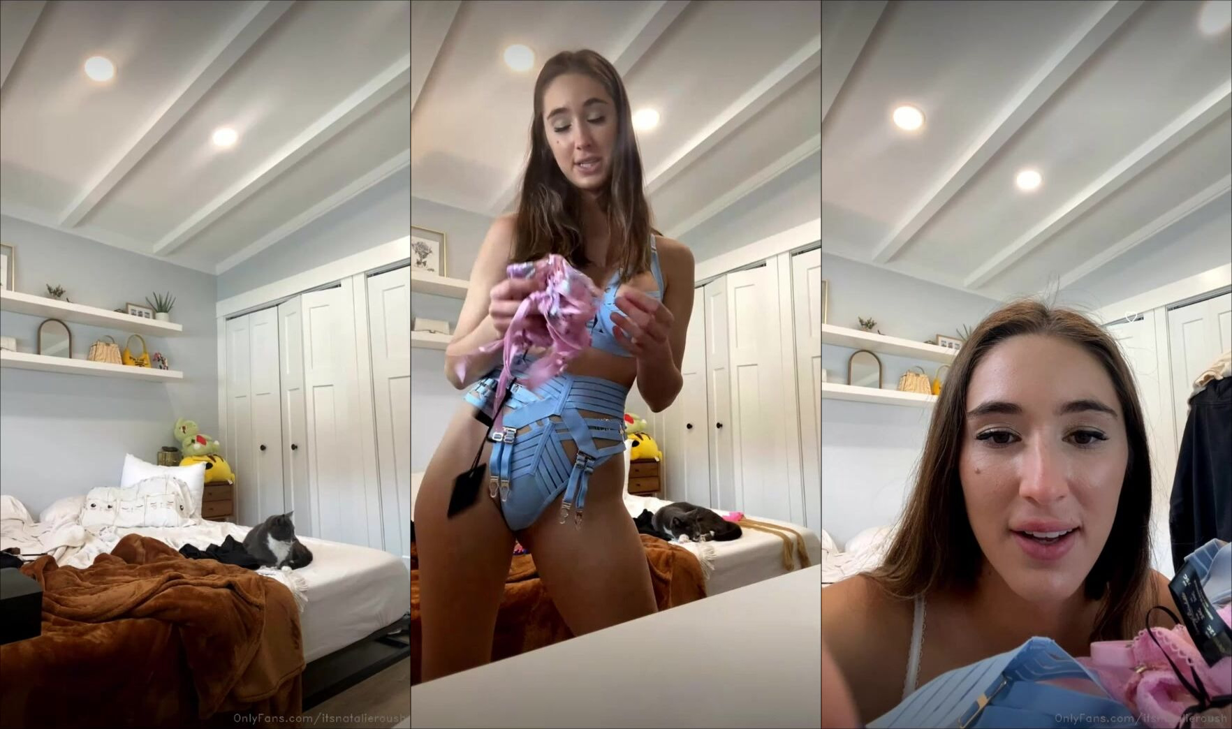Natalie Roush gets playful in this live stream, teasing with her blue lingerie while holding a pink toy.