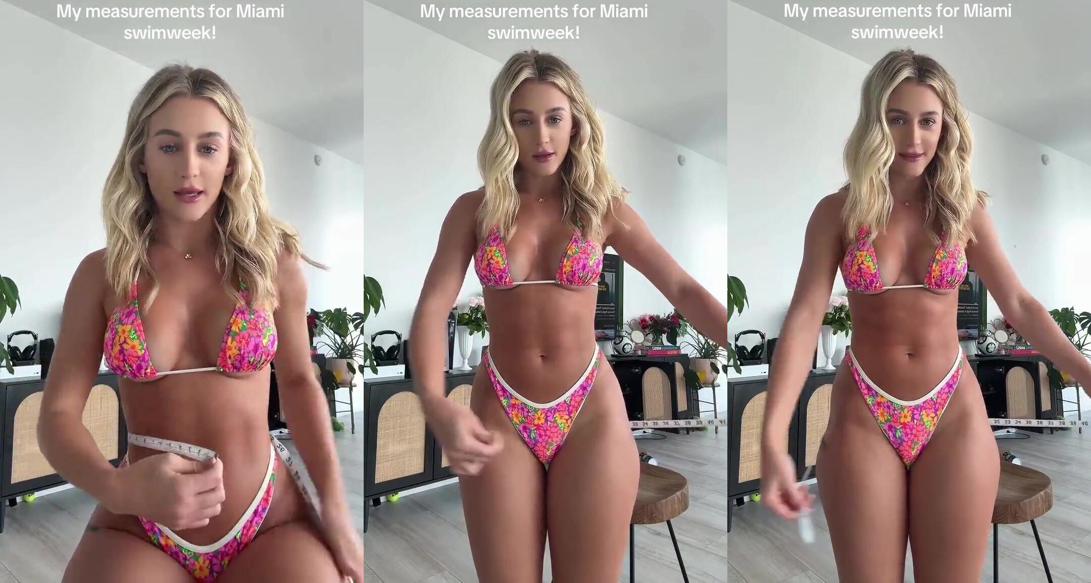 Blonde babe Abby show off in a colorful bikini showcasing her curves for Miami Swim Week