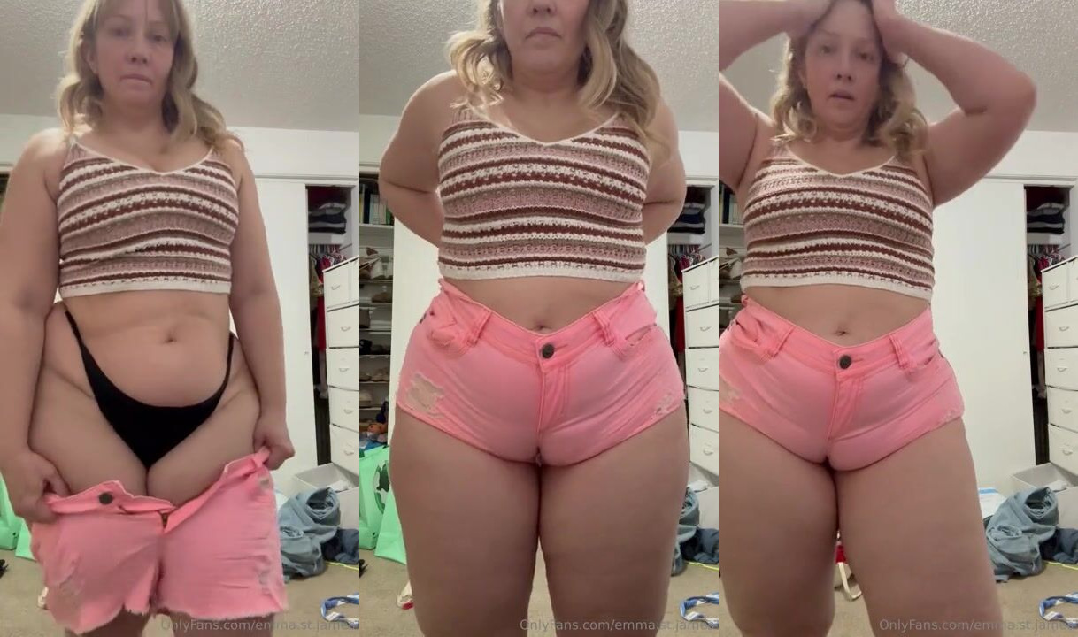 Curvy Goddess Emma.st.james tries on tight pink shorts and a crop top, showcasing her thick thighs and cleavage in this steamy OnlyFans video.