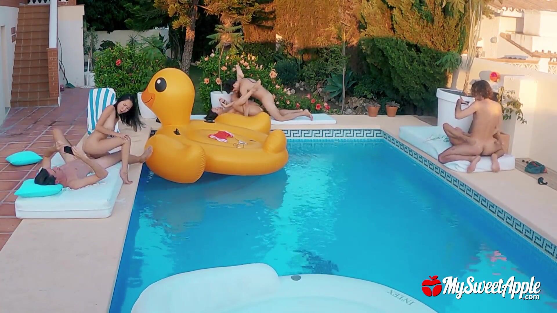 MySweetApple stars in a steamy wet n wild pool party group sex romp leaked video - Teasing bikinis