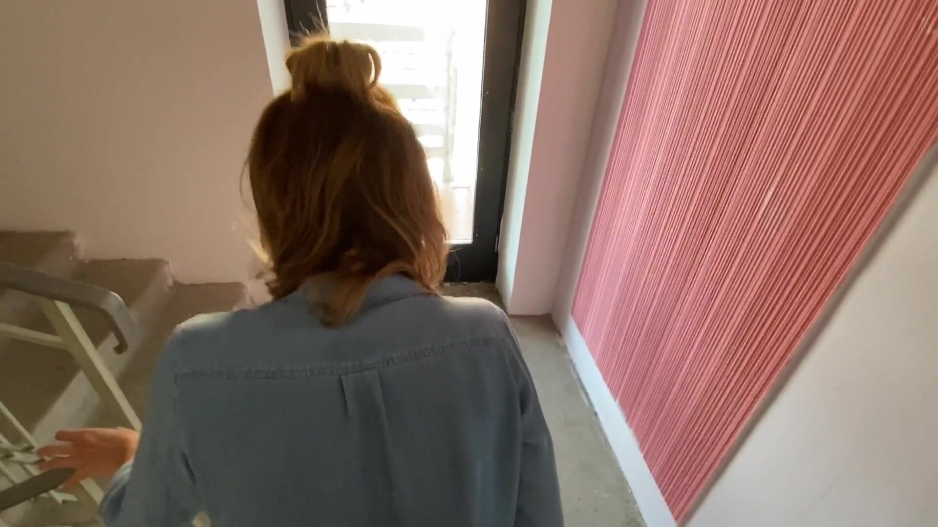 Risky blowjob and porn in public hallway with girlfriend